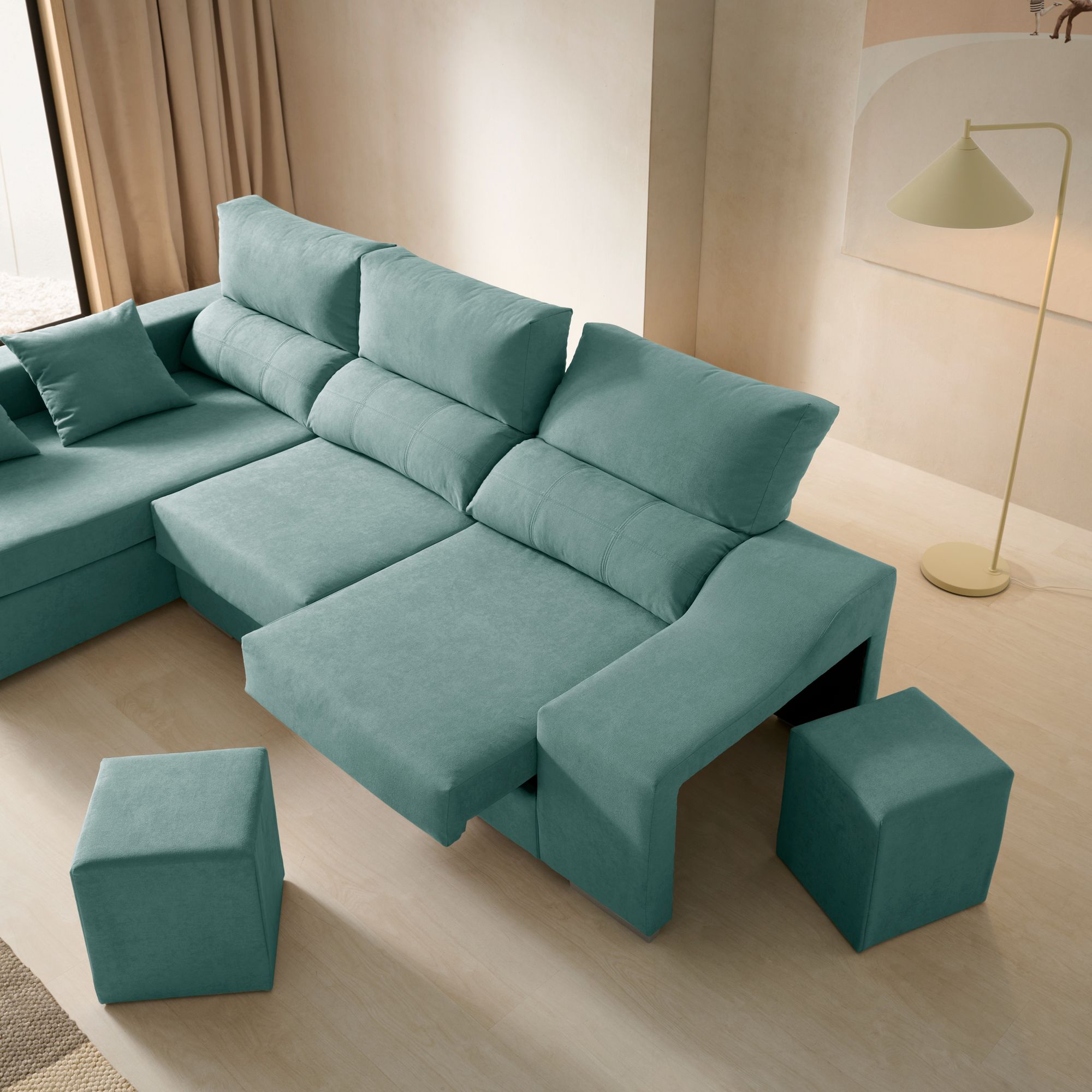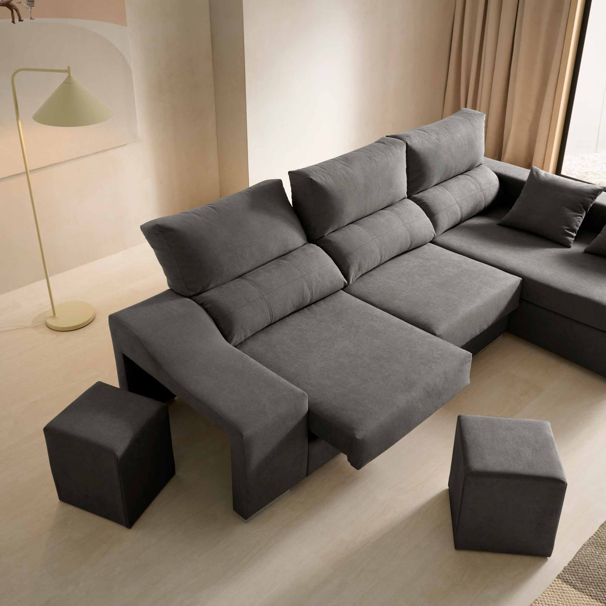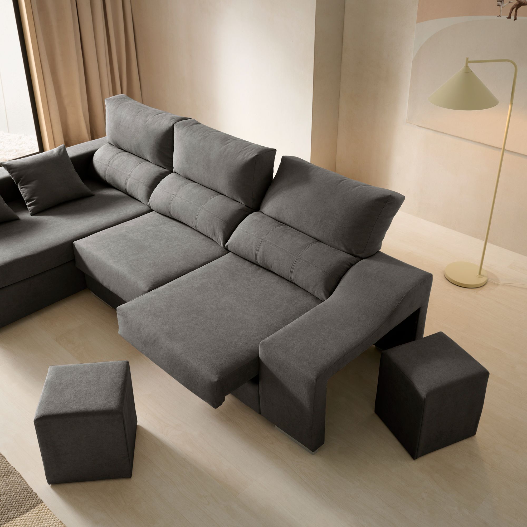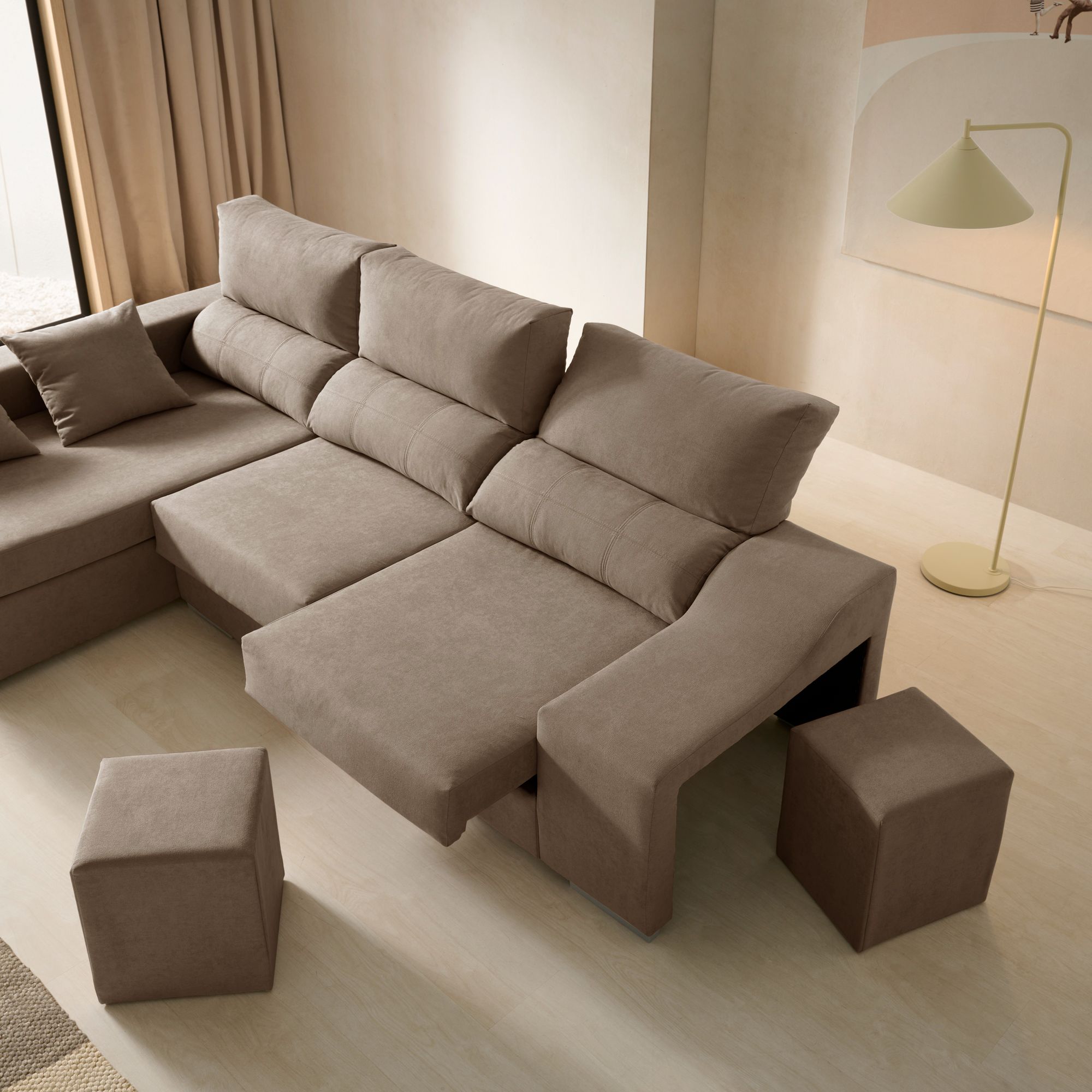2 puffs incorporados y arcón de almacenaje en el chaise longue.
