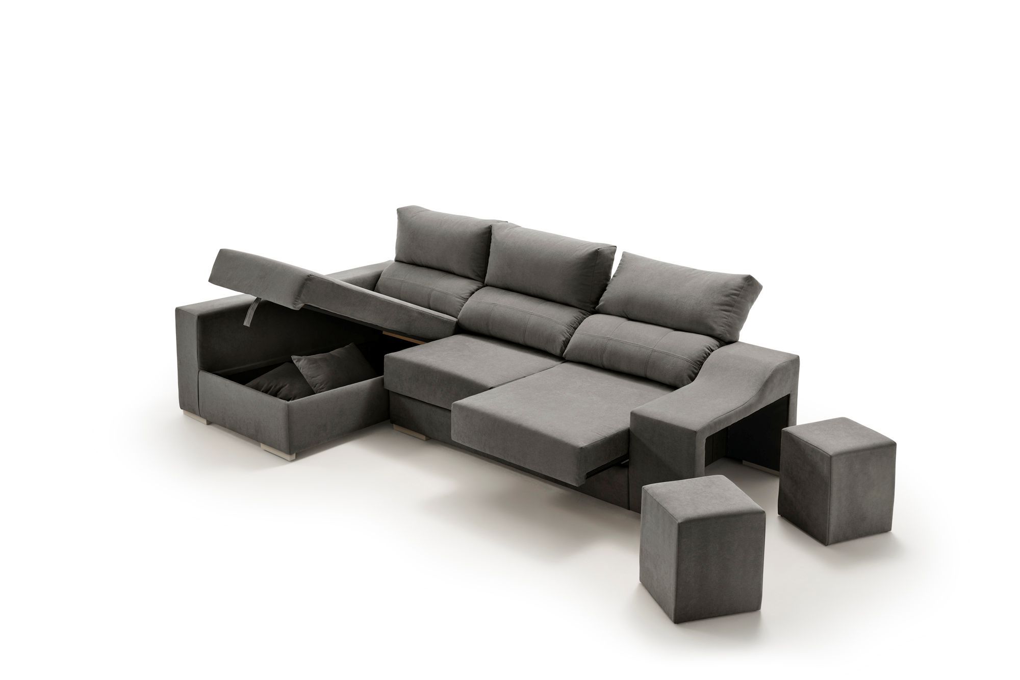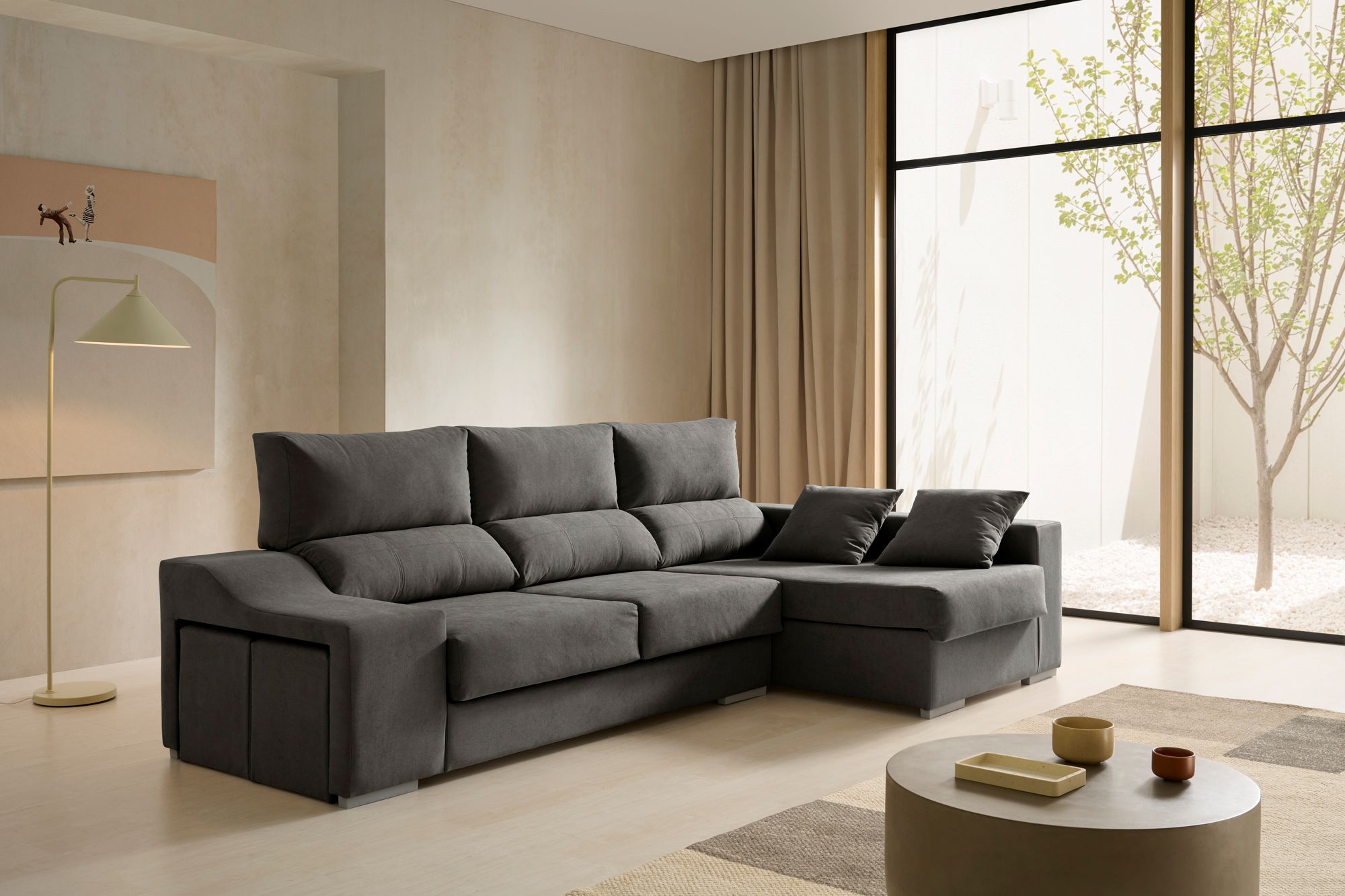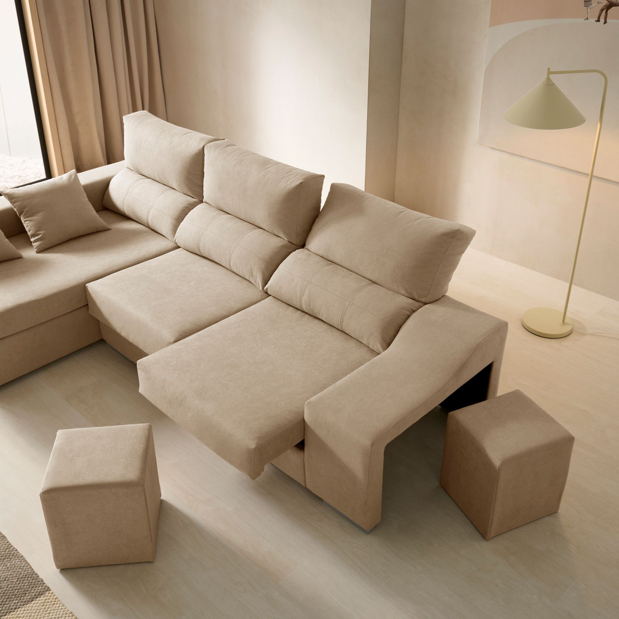 2 puffs incorporados y arcón de almacenaje en el chaise longue.