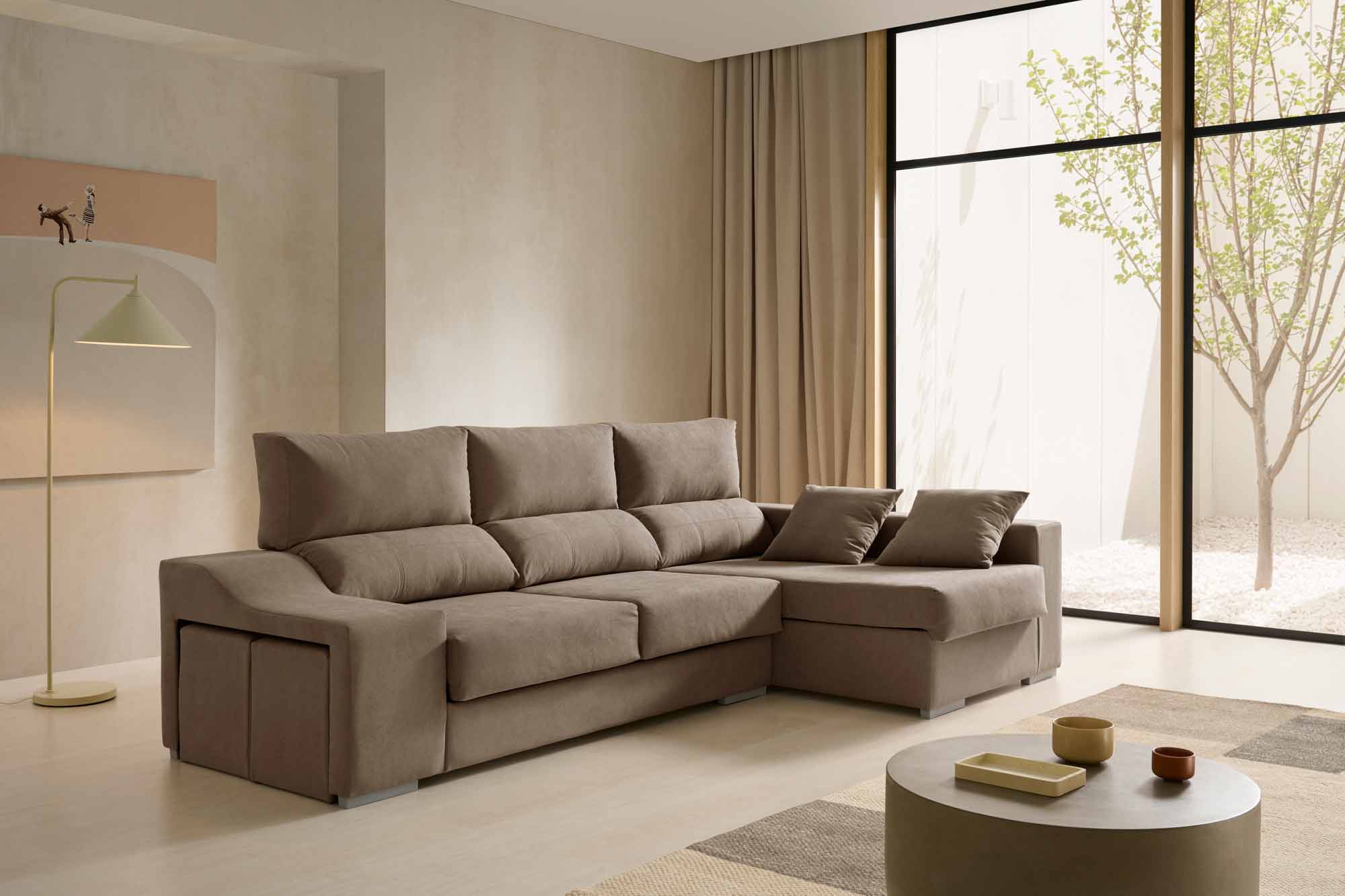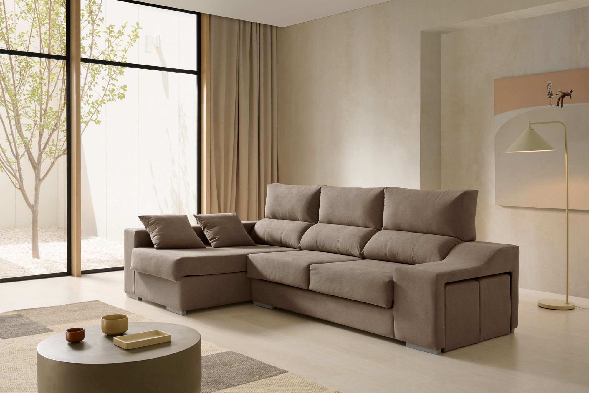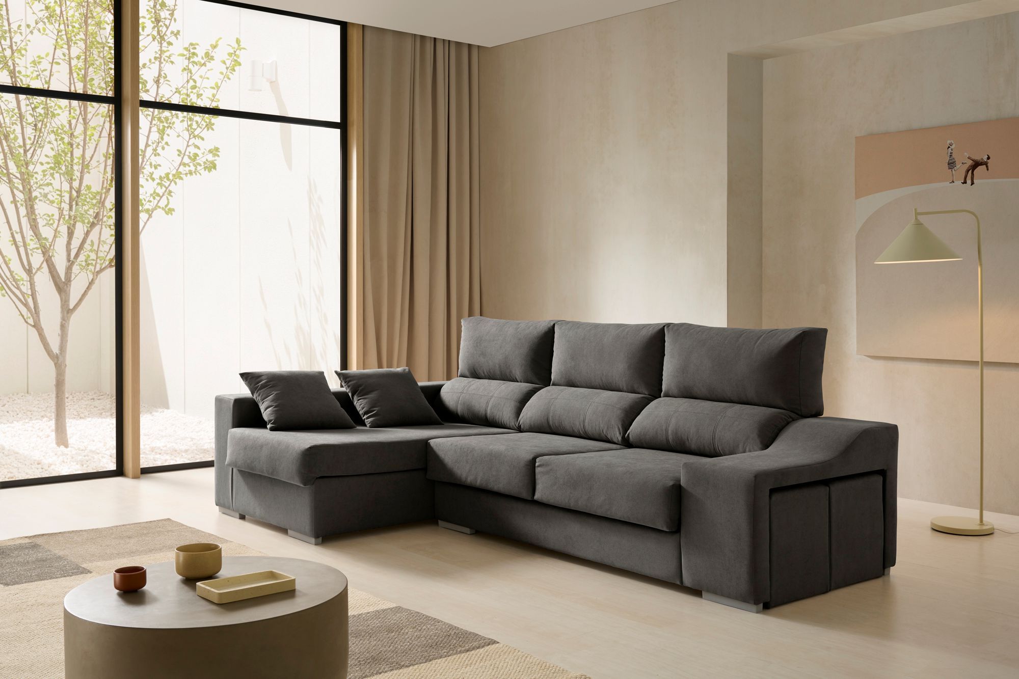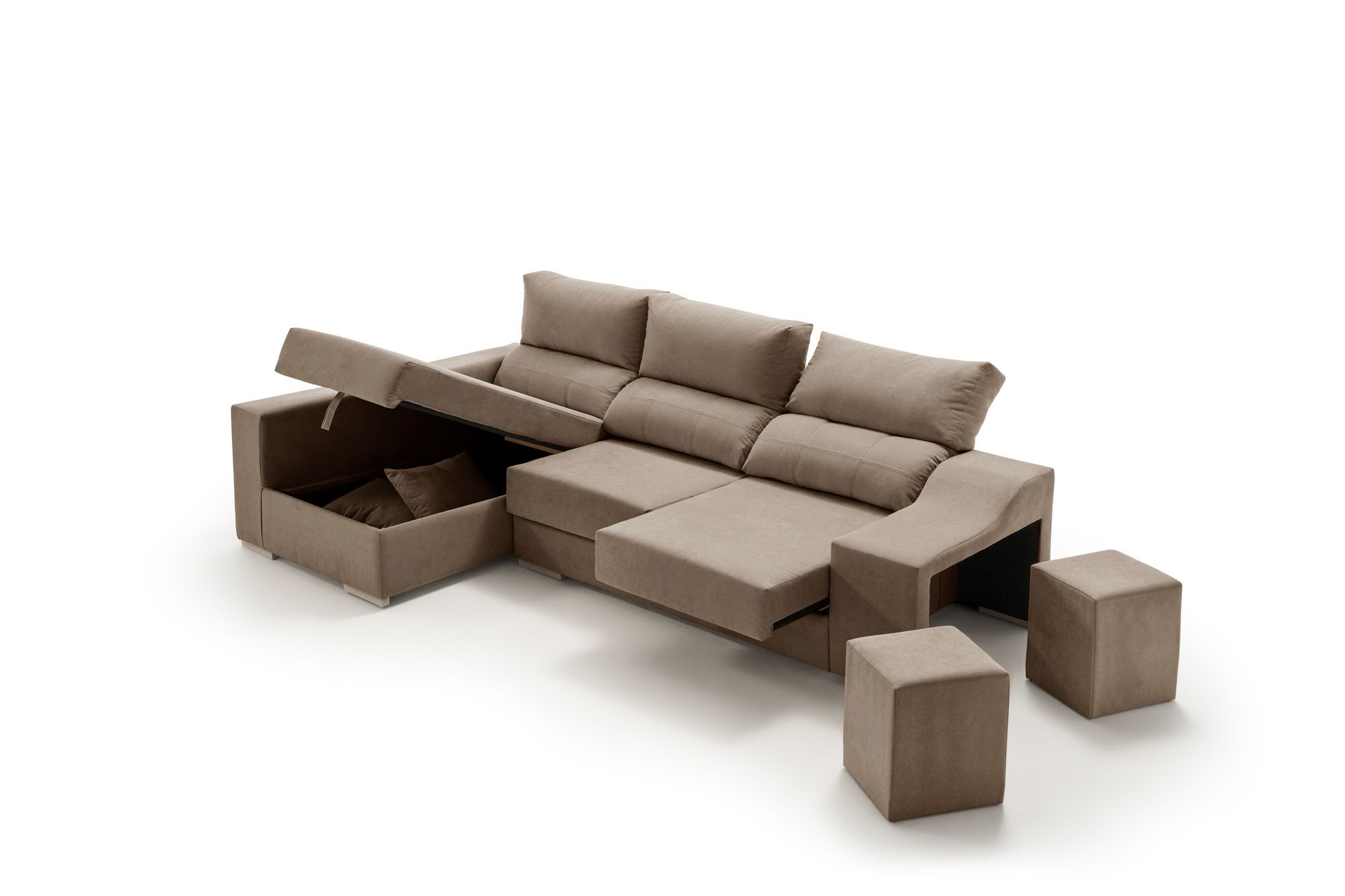2 puffs incorporados y arcón de almacenaje en el chaise longue.