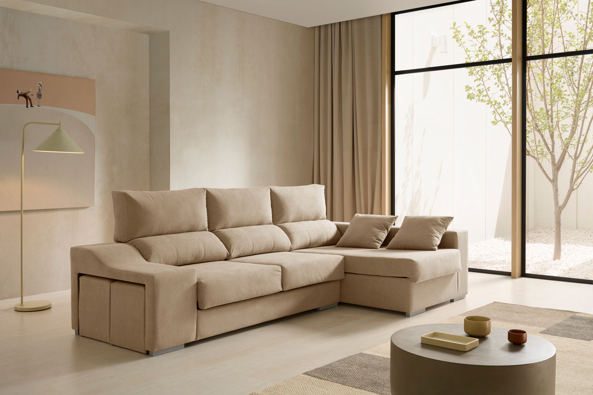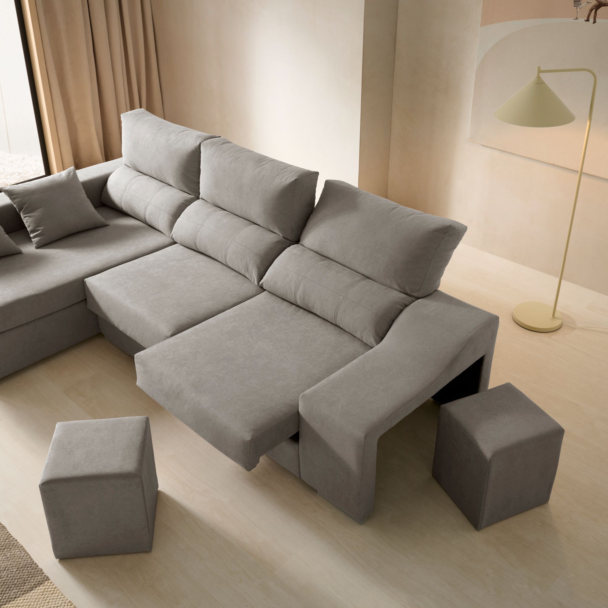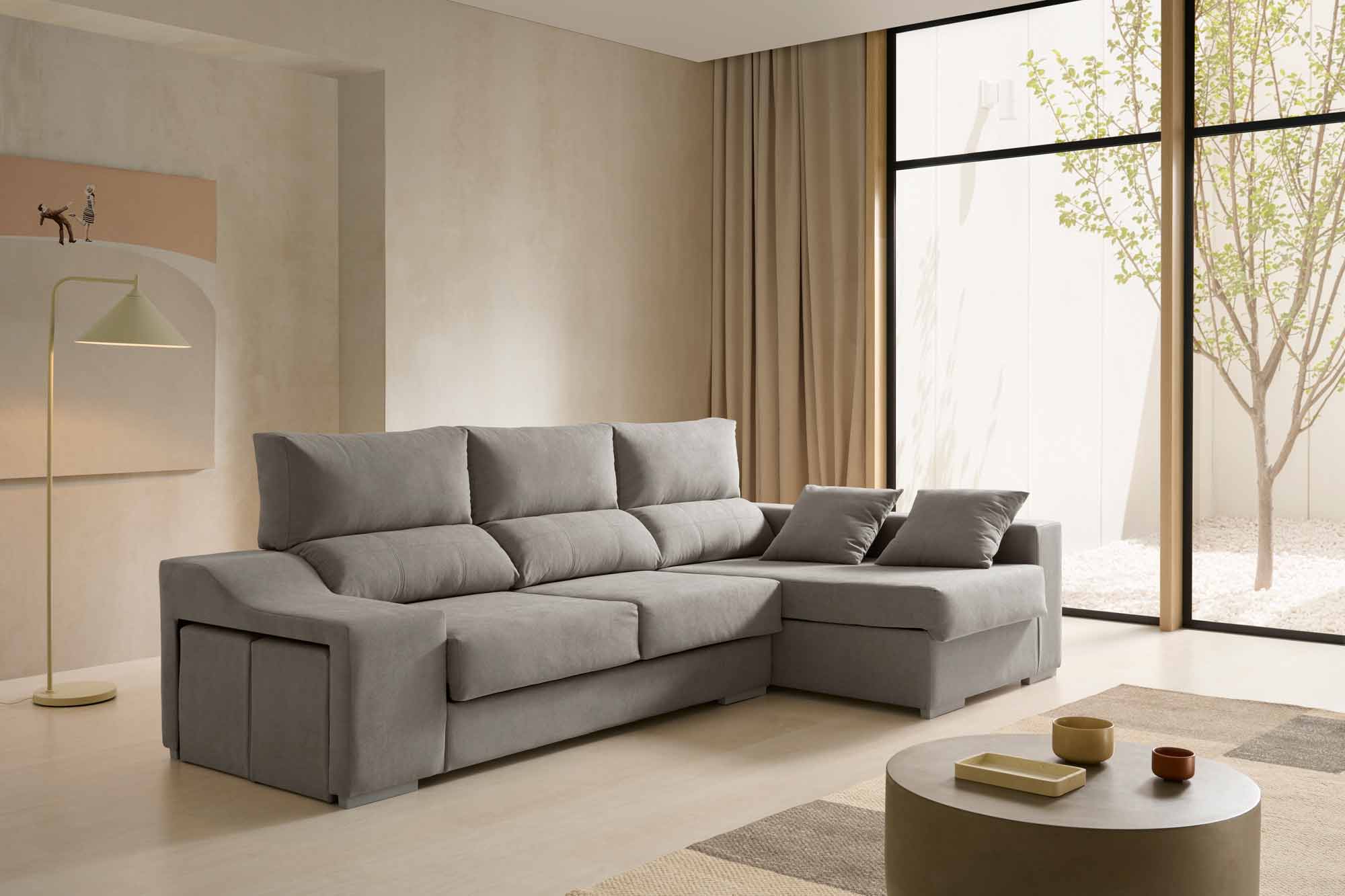 Con 2,65 metros de ancho, ofrece una amplia zona de descanso gracias a sus asientos deslizantes y respaldos reclinables, que permiten ajustar la postura de forma personalizada. Su chaise longue con arcón integrado brinda un generoso espacio de almacenaje, ideal para guardar mantas o cojines, mientras que sus 2 puffs extraíbles aportan versatilidad y funcionalidad para cualquier ocasión.