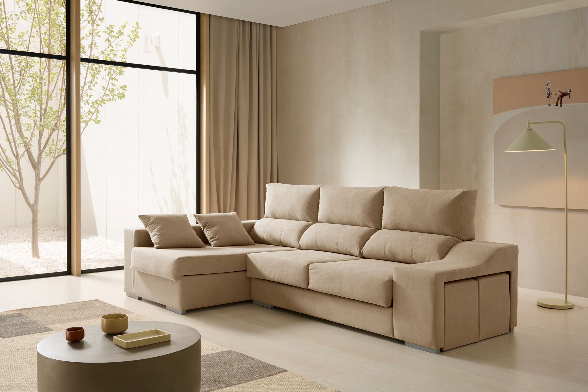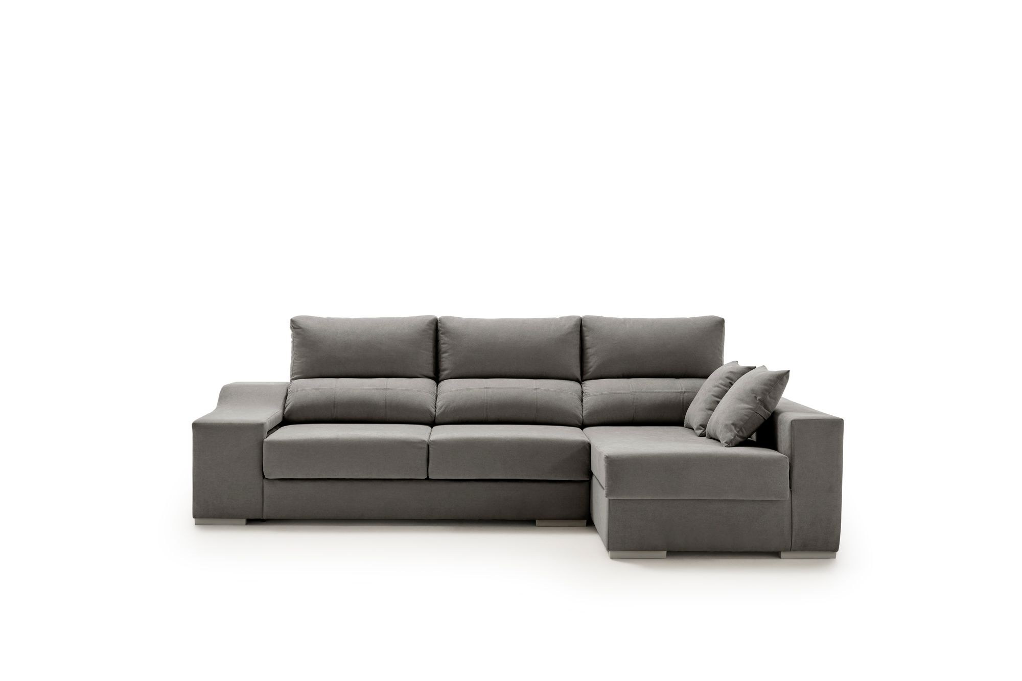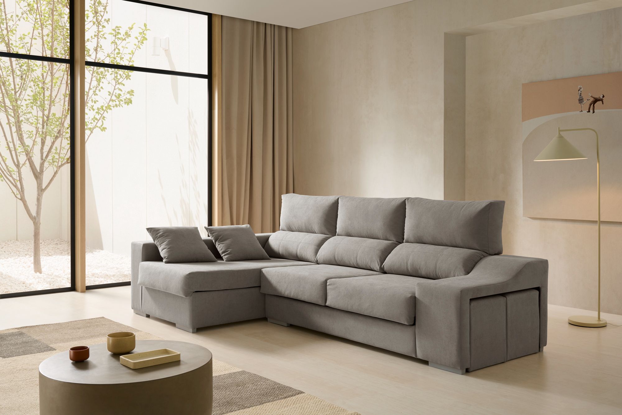 Con 2,65 metros de ancho, ofrece una amplia zona de descanso gracias a sus asientos deslizantes y respaldos reclinables, que permiten ajustar la postura de forma personalizada. Su chaise longue con arcón integrado brinda un generoso espacio de almacenaje, ideal para guardar mantas o cojines, mientras que sus 2 puffs extraíbles aportan versatilidad y funcionalidad para cualquier ocasión.