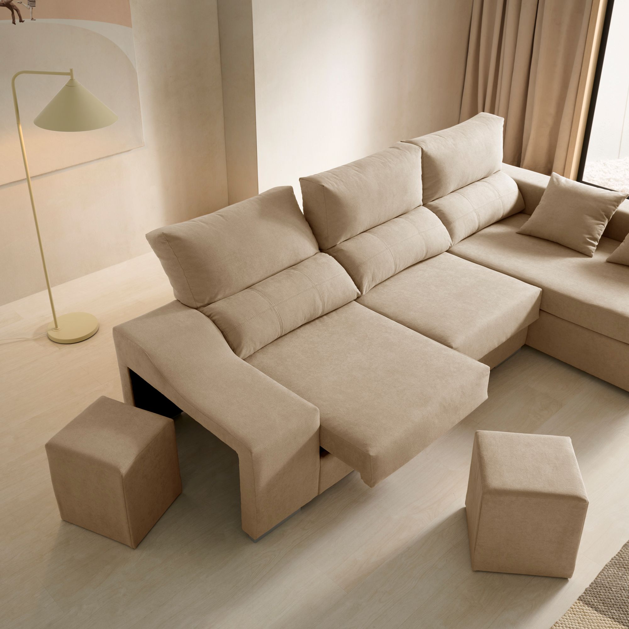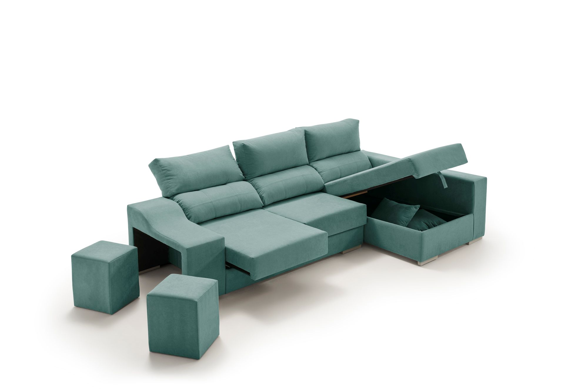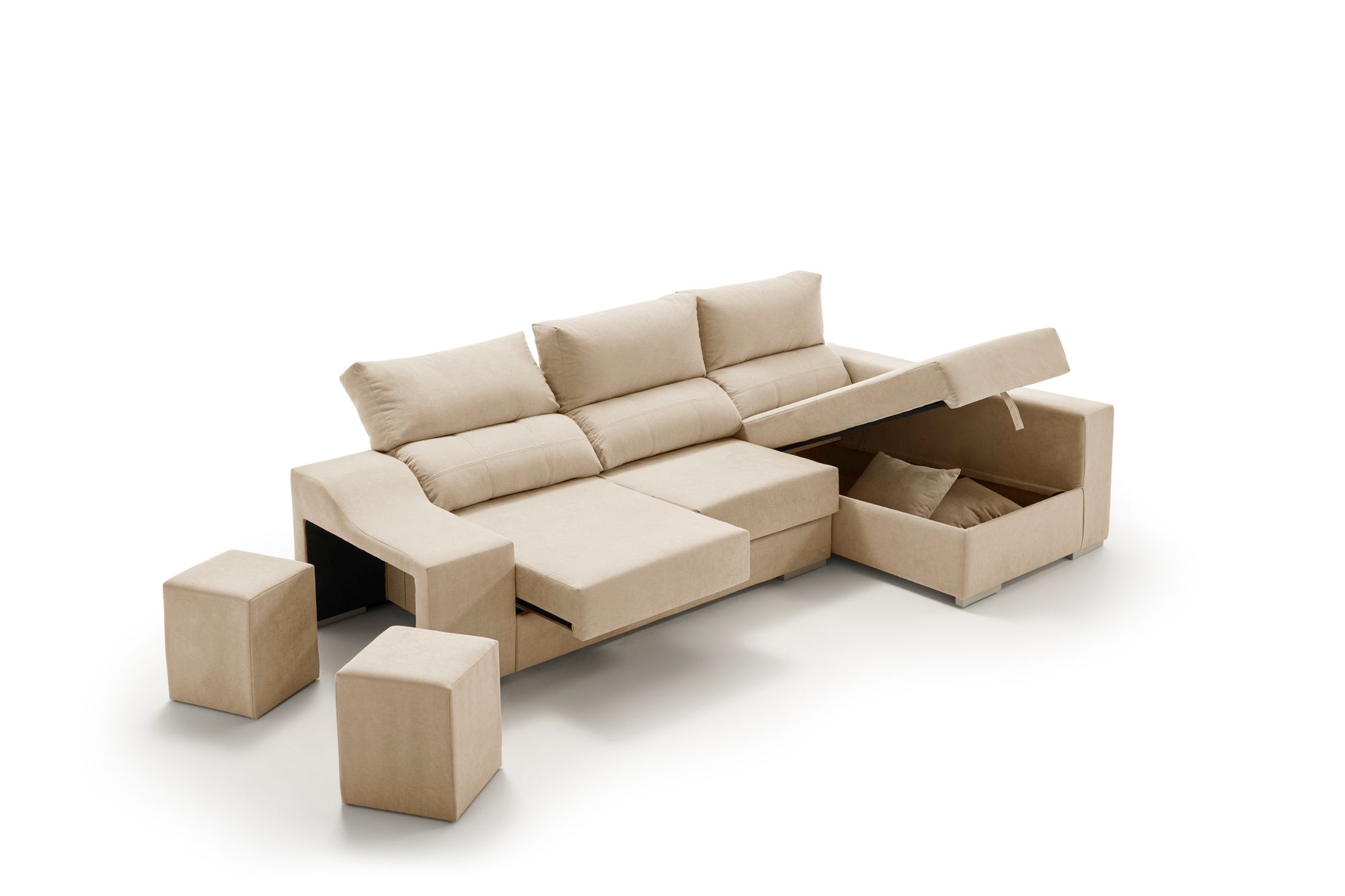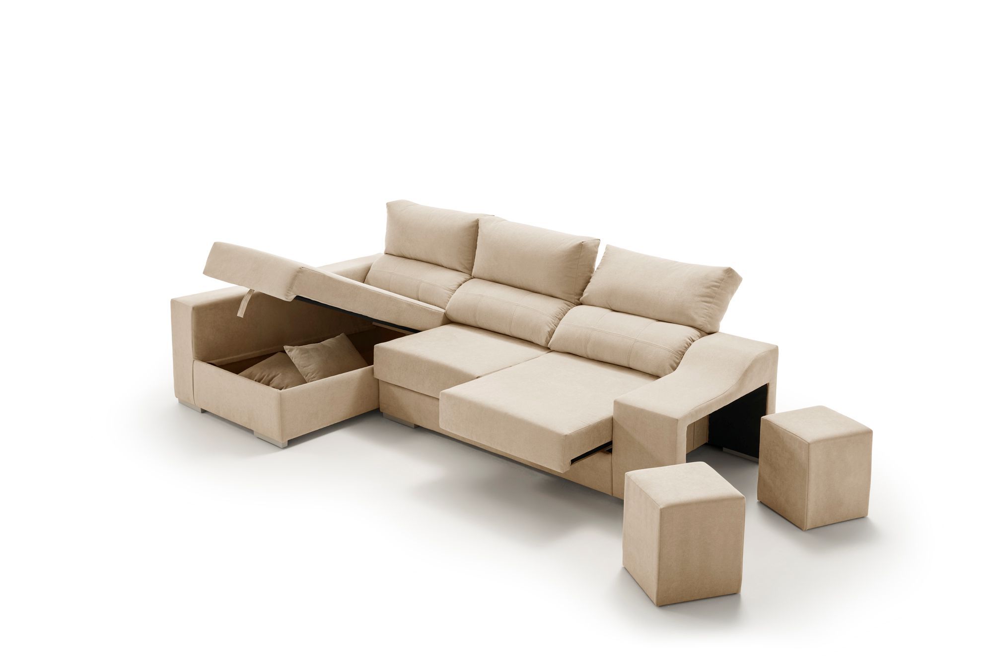 Arcón de almacenaje en el chaise longue y 2 puffs incorporados.