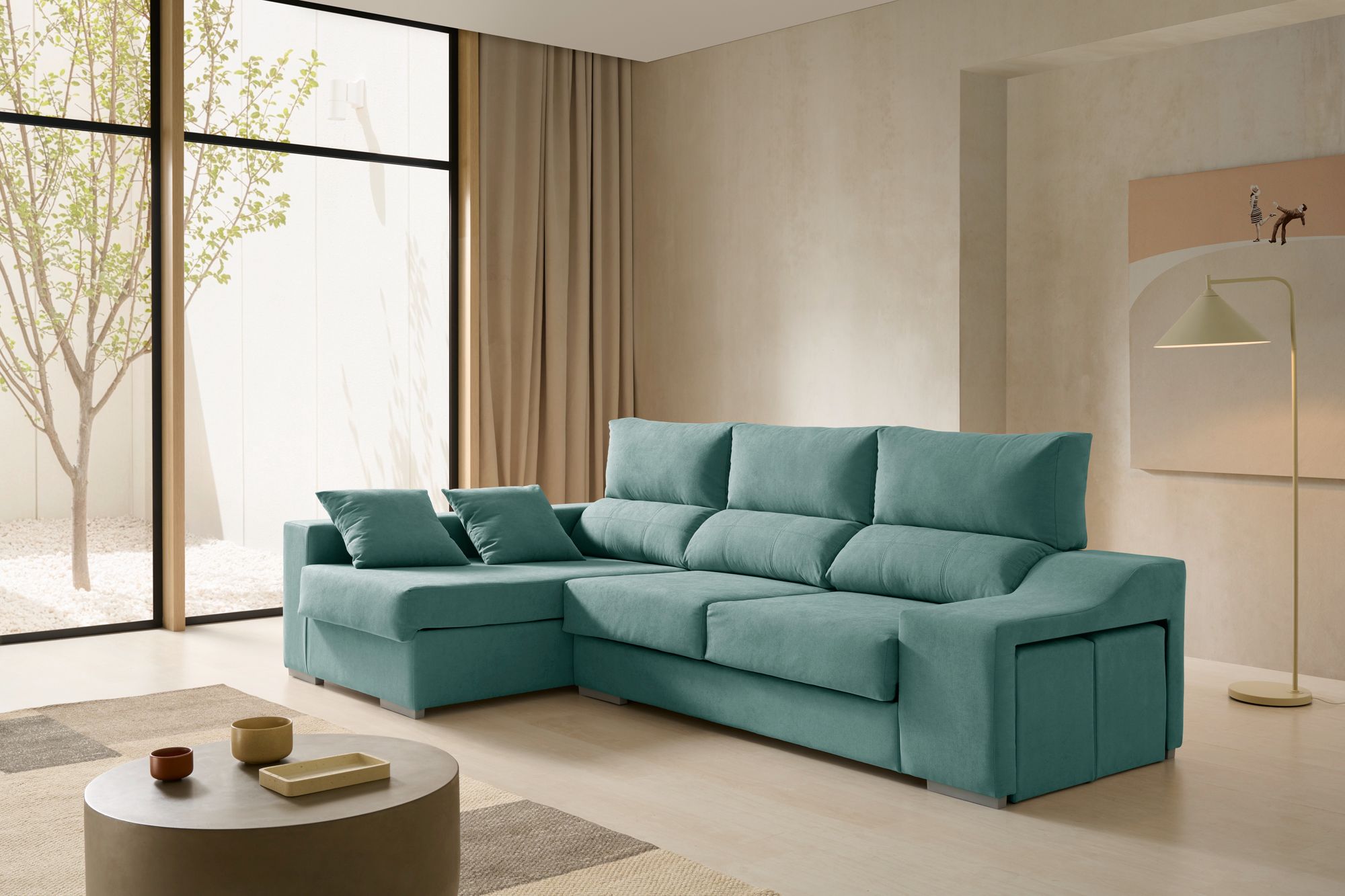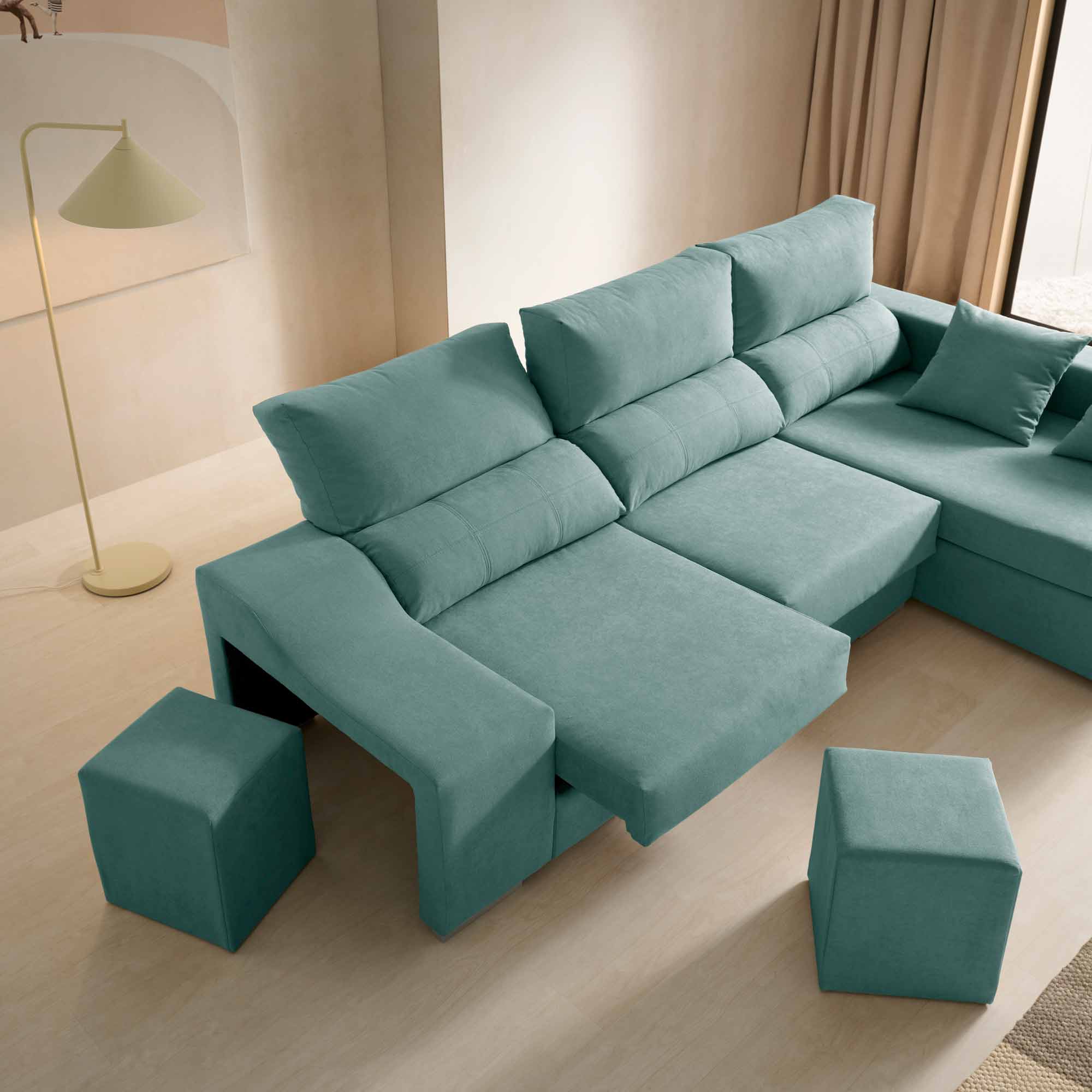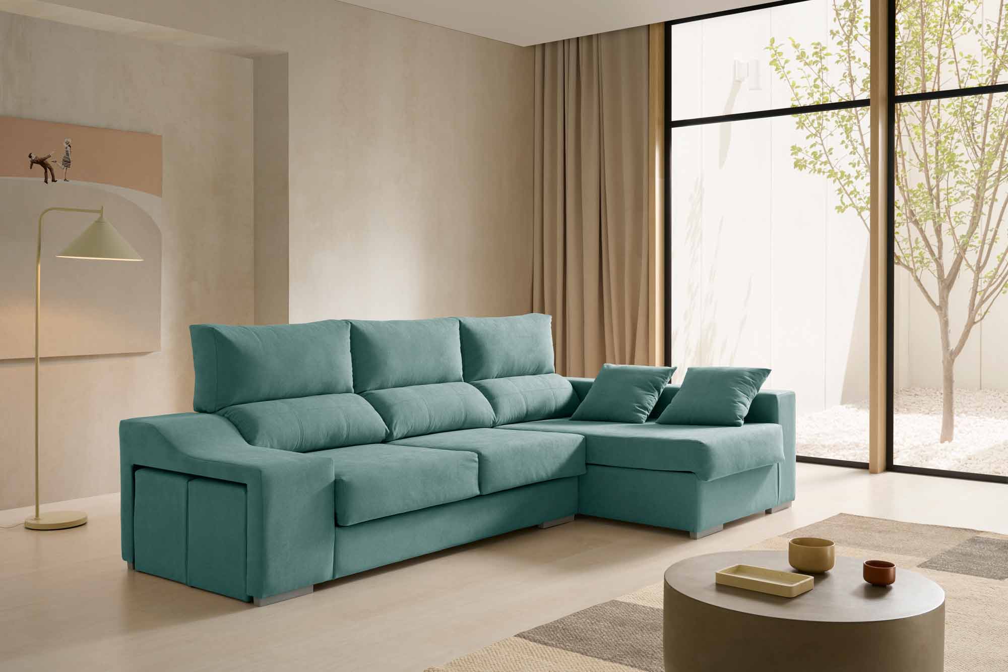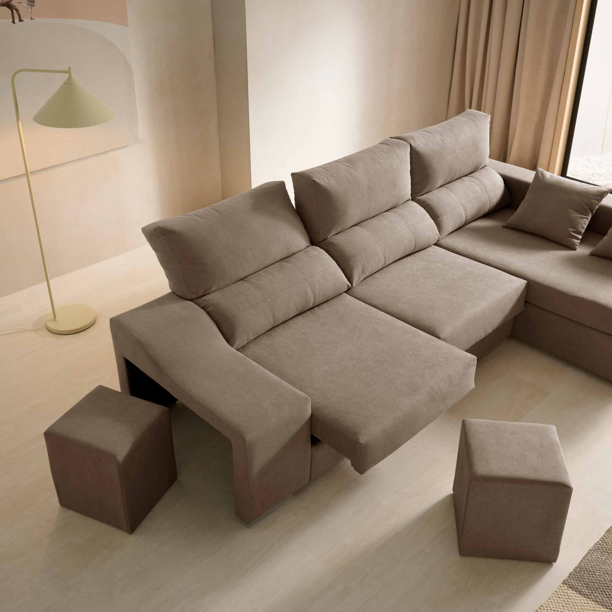 Arcón de almacenaje en el chaise longue y 2 puffs incorporados.